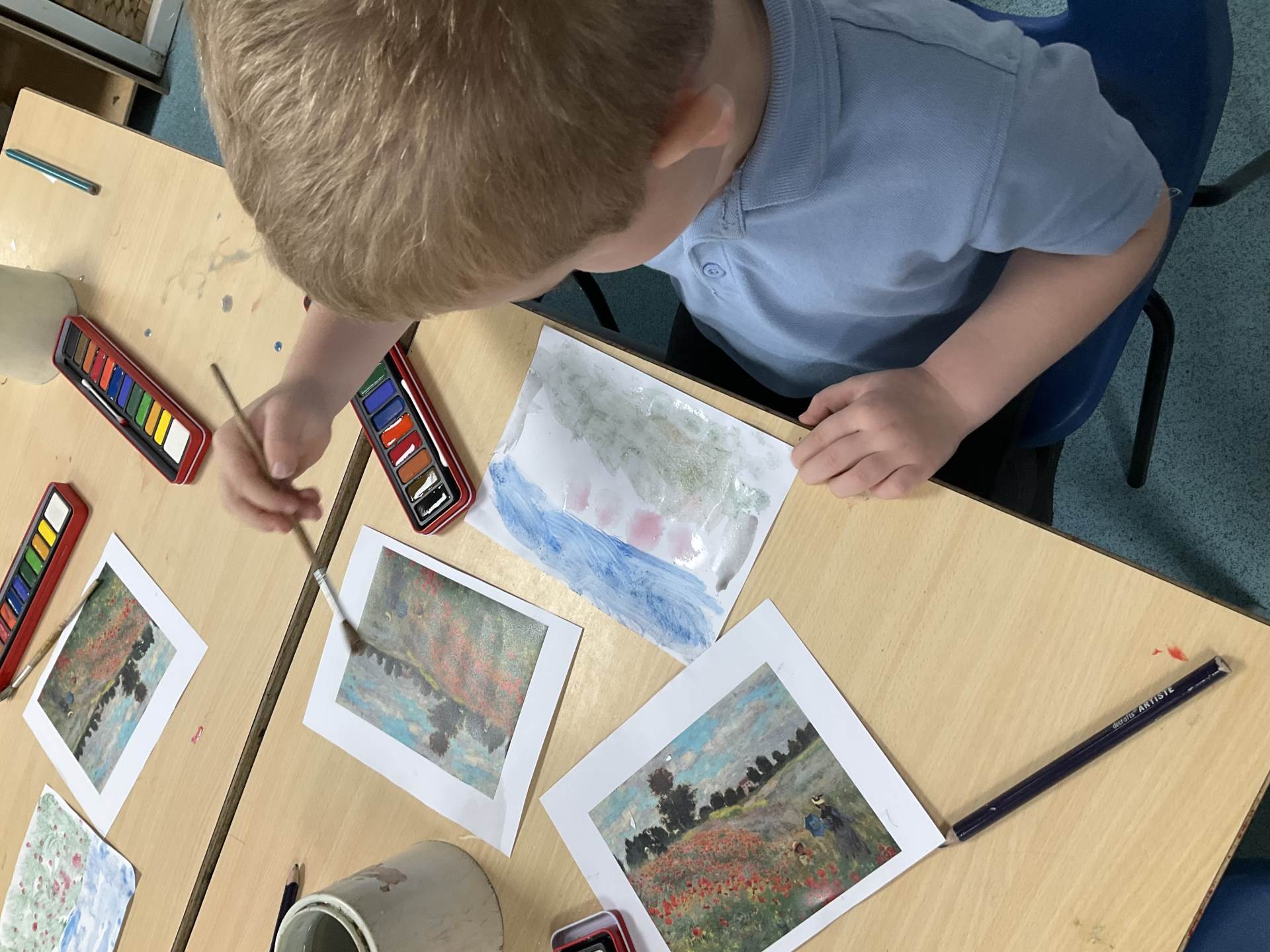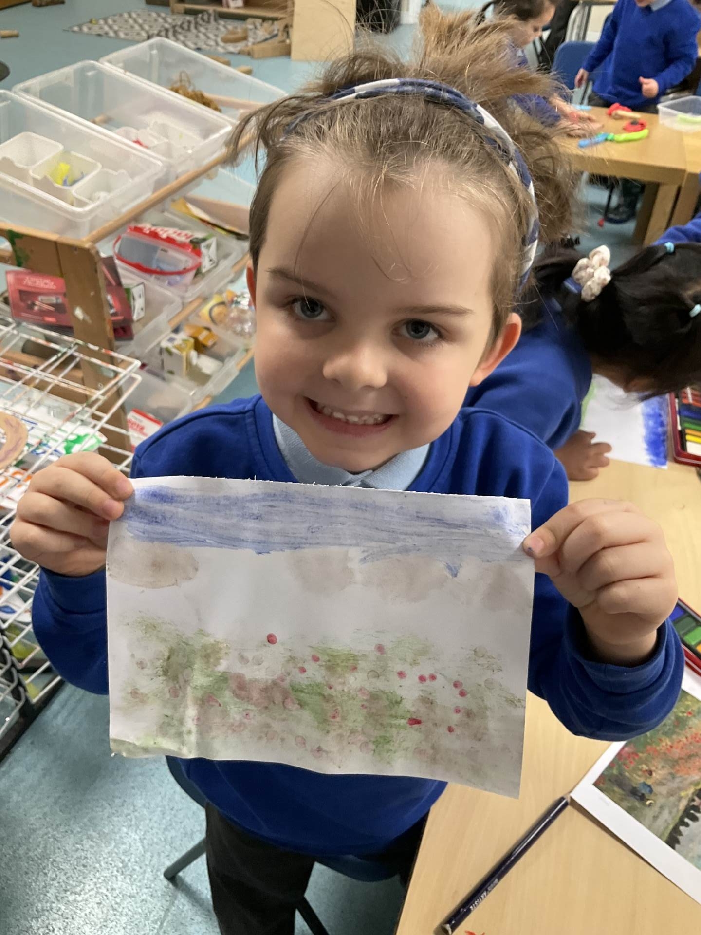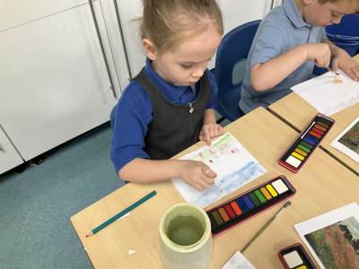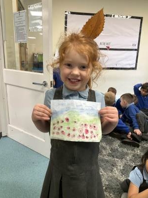 This week was Armistice Day and we talked about what it means and why we mark it. We looked at The Poppy Field painting by Monet and the children used watercolours to recreate it themselves.